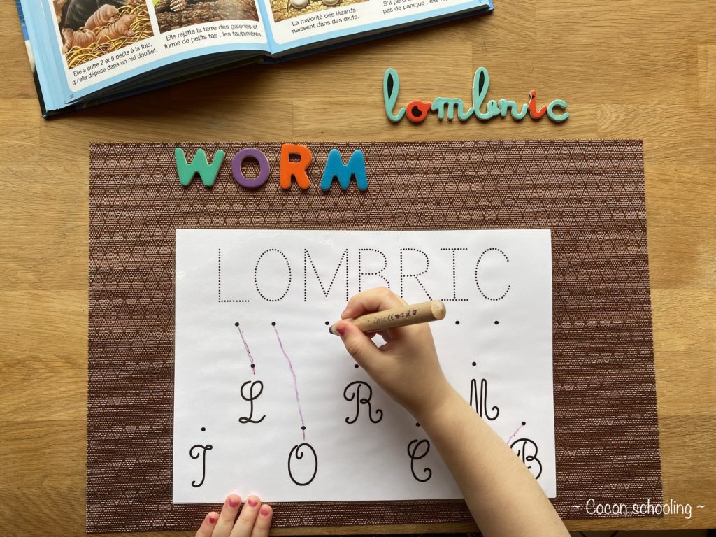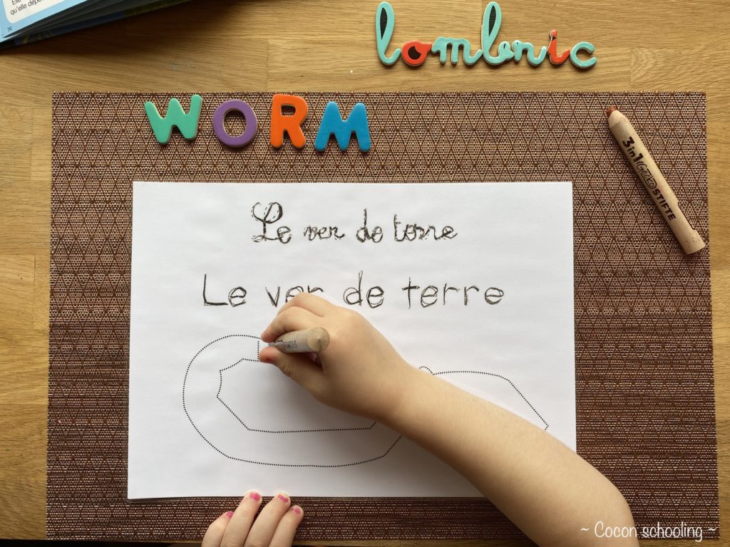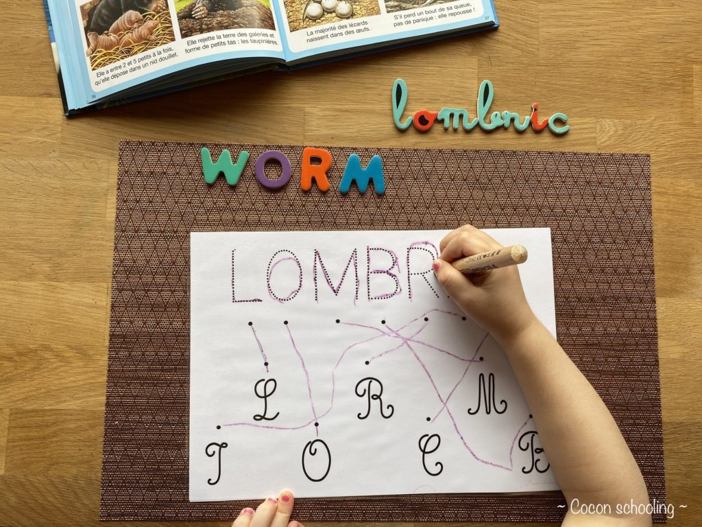 Voici notre thématique WORM ! C’était génial, on a toutes aimé et beaucoup appris. Le bac sensoriel est un récipient avec du papier crépon froissé, et les lombrics sont en pâte à modeler. Je lui ai demandé d’attraper les vers avec une pince et de mettre la bonne quantité en face de la bonne couleur.