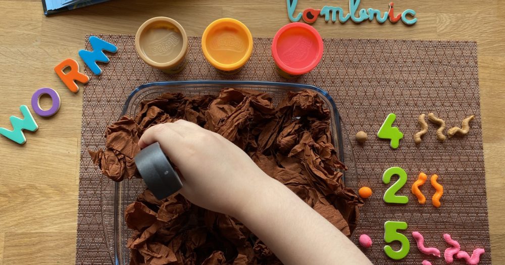 Voici notre thématique WORM ! C’était génial, on a toutes aimé et beaucoup appris. Le bac sensoriel est un récipient avec du papier crépon froissé, et les lombrics sont en pâte à modeler. Je lui ai demandé d’attraper les vers avec une pince et de mettre la bonne quantité en face de la bonne couleur.