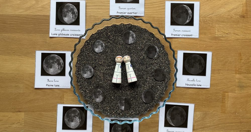 Je vous présente le bac sensoriel, j’ai réutilisé le sable volcanique que j’aime énormément. Le but étant de refaire le cycle en suivant les cartes de nomenclature.