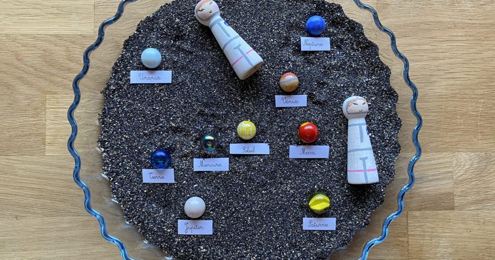 Voici les soeurs Shérine et Maya dans le système solaire, imaginé avec du sable noir volcanique, et de jolies billes qui étaient à moi petite.