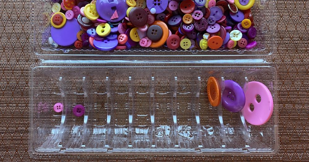 Tellement fan de mes boutons, on peut faire beaucoup de choses. La preuve encore ici avec une boîte de gâteau vide, ma grande à fait le tri des tailles. Elle c’est bien amusée car elle aime beaucoup les manipuler avec toutes ces jolies couleurs.