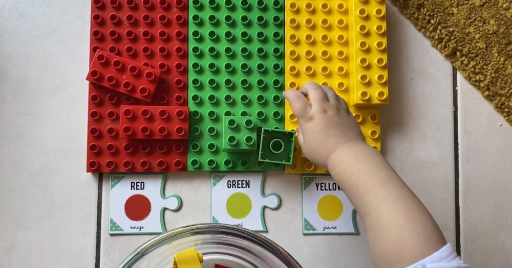 Nous commençons de plus en plus à faire des activités avec ma petite qui aime beaucoup mais n’a aucune patience, elle va faire un atelier puis partir comme une voleuse quelque minutes après. Ici vous pouvez voir un atelier pour le tri des couleurs, avec des duplos, et des cartes puzzle anglais/français.