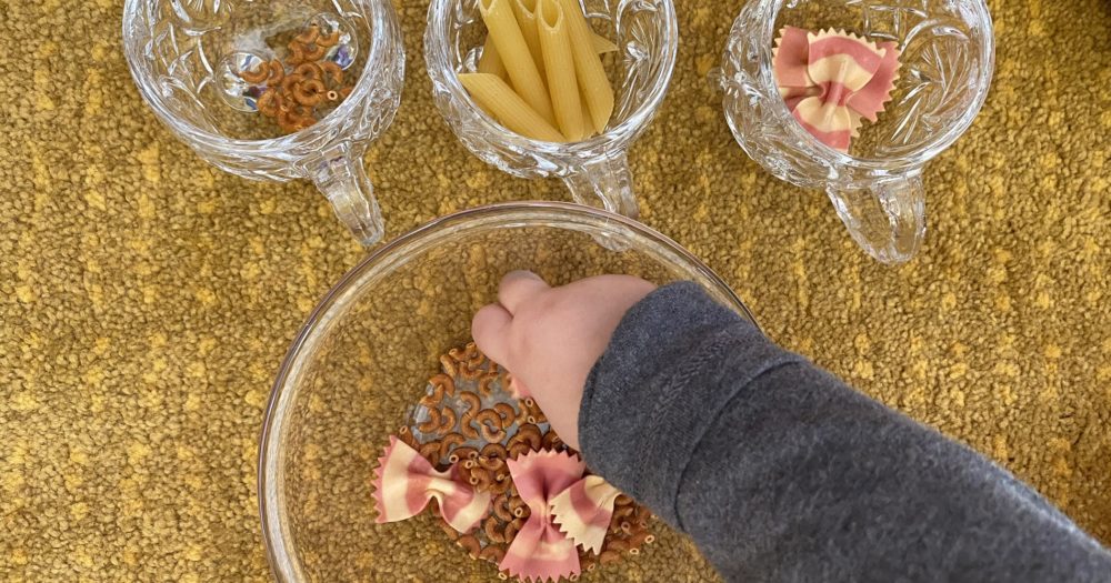 Le tri des pâtes plait beaucoup aux jeunes enfants, j’ai choisi des modèles très différents pour un premier essai, après on prendra des modèles plus similaires. Ceci fait parti de la pédagogie montessori.